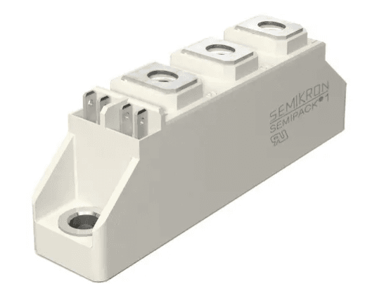 SEMIKRON SKKT42/12E Id.no- 07211460 es un módulo tiristor con 2 interruptores de 7 pines que cuenta con juntas soldadas para alta fiabilidad y transferencia térmica a través de la placa base metálica aislada con cerámica de óxido de aluminio.